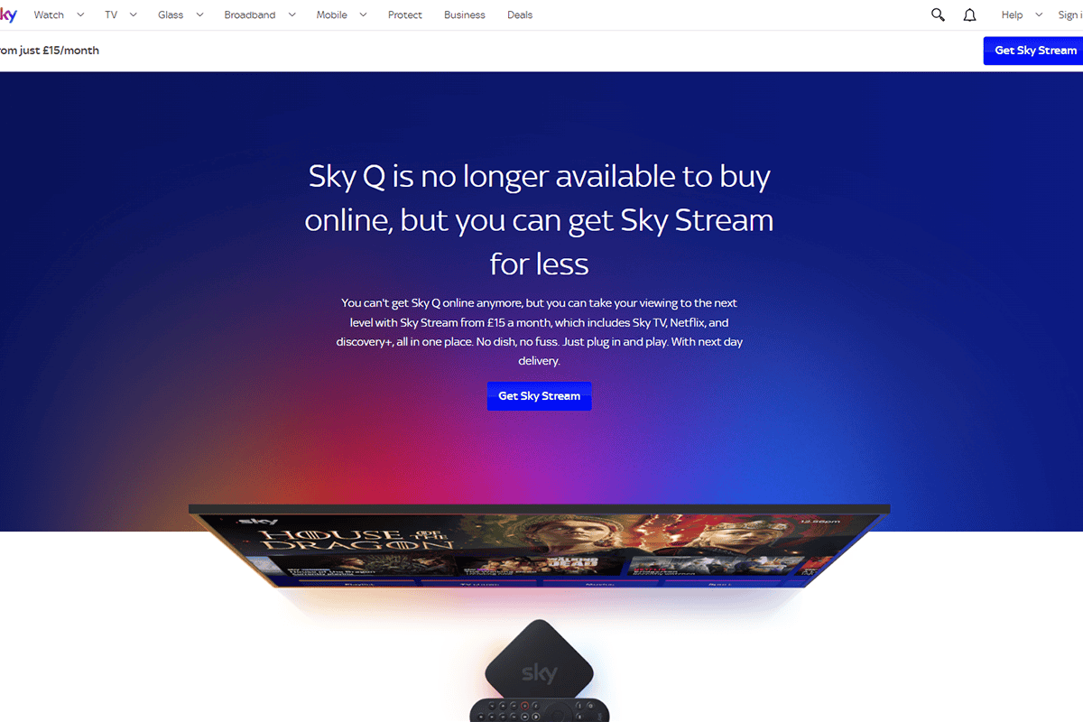 “Sky Q is no longer available to buy online, but you can get Sky Stream for less. You can’t get Sky Q online anymore, but you can take your viewing to the next level with Sky Stream from £15 a month, which includes Sky TV, Netflix, and discovery+, all in one place. No dish, no fuss. Just plug in and play. With next day delivery.”
